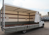 Стальная бортовая платформа с алюминиевыми откидными бортами высотой 400мм (возможно 600мм, 800мм и далее), запорная фурнитура из оцинкованной стали, пол – сетчатая фанера, разборный каркас тента из стальных профилей, материал тента – импортный ПВХ серого цвета.