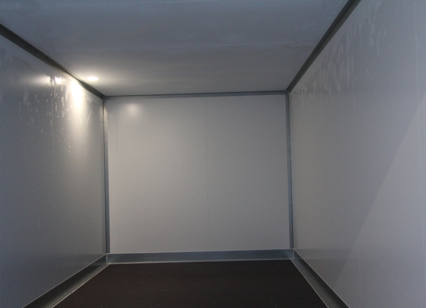 Стены выполнены по сэндвич технологиям: оцинкованная сталь с полимерным покрытием наклеена на фанеру для большей жесткости фургона, наружное обрамление фургона – анодированный алюминиевый уголок, задняя рамка фургона и фурнитура дверей – оцинкованная сталь, пол – ламинированная сетчатая фанера, плафон освещения внутри фургона.