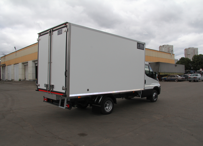Фургон из сэндвич панелей (утеплитель ППС экструдированный 50мм (теплопроводность 0,035 вт/м3), обшивка фургона – оцинкованная сталь с полимерным покрытием, наружное обрамление фургона – анодированный алюминиевый уголок, задняя рамка фургона и фурнитура дверей – оцинкованная сталь, пол – ламинированная сетчатая фанера, плафон освещения внутри фургона.