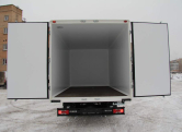 Стены выполнены по сэндвич технологиям: оцинкованная сталь с полимерным покрытием наклеена на фанеру для большей жесткости фургона, наружное обрамление фургона – анодированный алюминиевый уголок, задняя рамка фургона и фурнитура дверей – оцинкованная сталь, пол – ламинированная сетчатая фанера, плафон освещения внутри фургона.